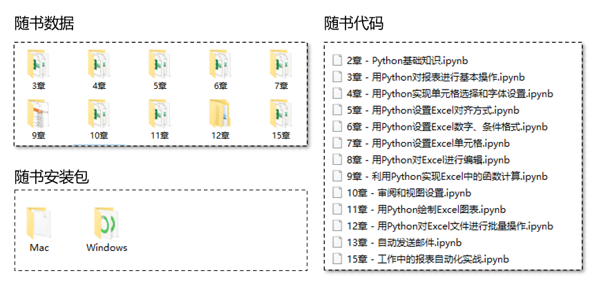 - 第 4 部分介绍报表自动化相关的其他技能,比如自动发送邮件、批量修改文件夹等操作。