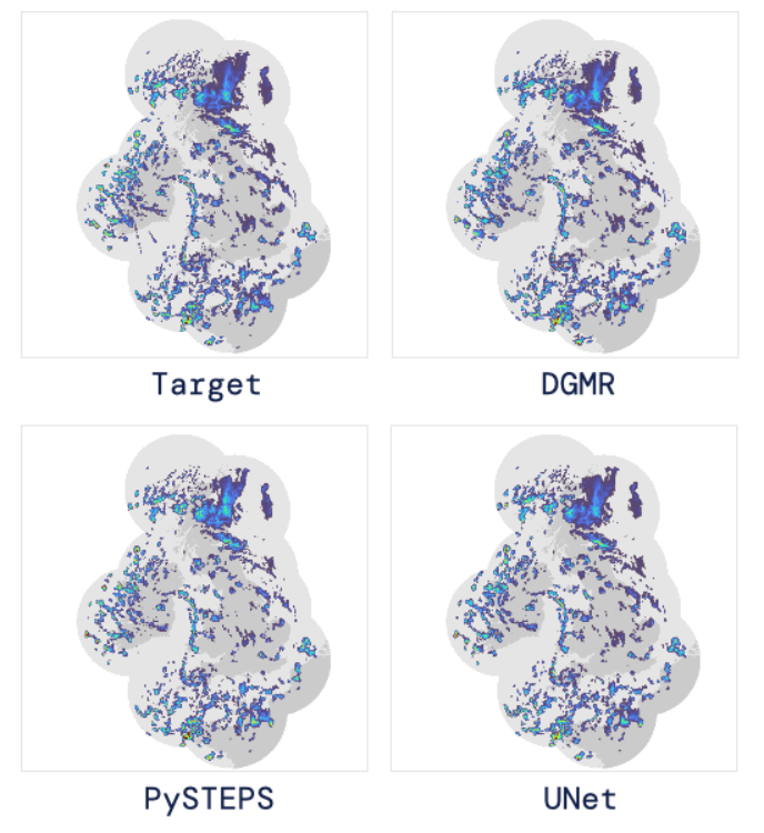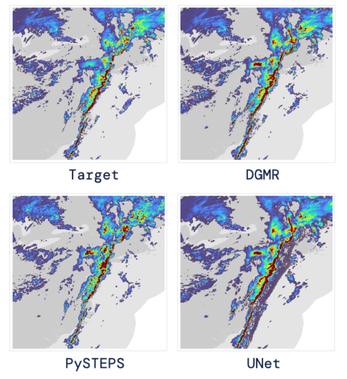 2019 年 4 月在美国东部发生的强降水事件(预测目标是观测到的雷达数据)。与平流方法 (PySTEPS) 相比,生成方法 DGMR 平衡了降水的强度和范围,而前者的预测强度通常太高;并且DGMR的预测不像确定性深度学习方法 (UNet) 那样模糊