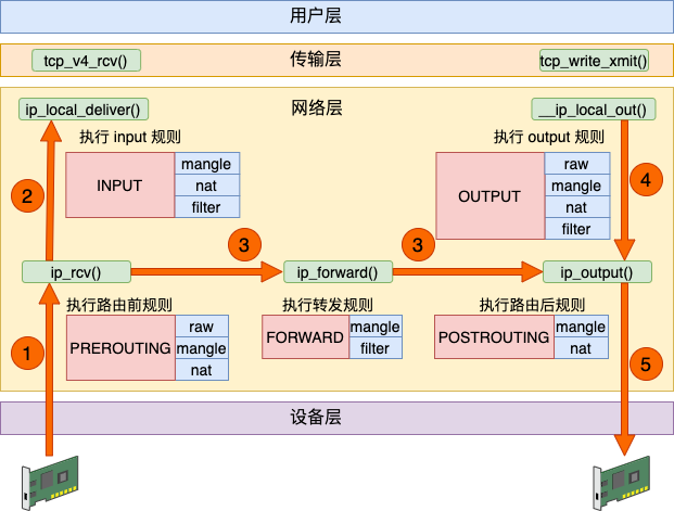 数据接收过程走的是 1 和 2,发送过程走的是 4 、5,转发过程是 1、3、5。有了这张图,我们能更清楚地理解 iptable 和内核的关系。