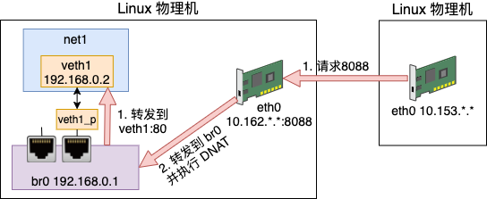 bridge 当然知道 192.168.0.2 是 veth 1。于是,在 veth1 上监听 80 的服务就能收到来自外界的请求了!我们来总结一下这个接收过程