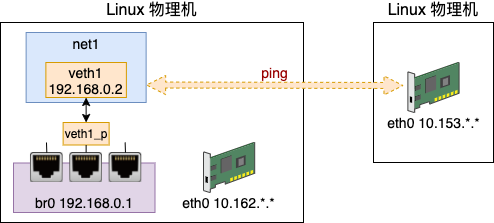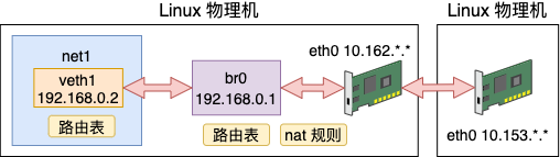 我们先来创建一个虚拟的网络环境出来,其命名空间为 net1。宿主机的 IP 是 10.162 的网段,可以访问外部机器。虚拟网络为其分配 192.168.0 的网段,这个网段是私有的,外部机器无法识别。