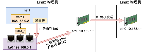 我们这次的需求是实现内部虚拟网络访问外网,所以需要使用的是 SNAT。它将 namespace 请求中的 IP(192.168.0.2)换成外部网络认识的 10.153.*.*,进而达到正常访问外部网络的效果。