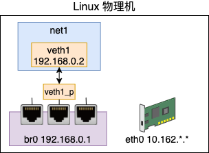 创建一个 veth 对儿(veth1 - veth1_p),把其中的一头 veth1 放在 net1 中,给它配置上 IP,并把它启动起来。