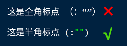 引号、冒号等标点用半角。推荐小白用全半角区别明显的字体,比如Consolas