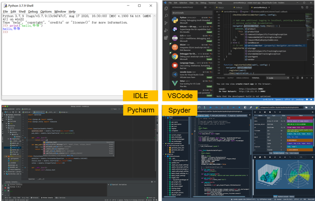 装好Python后,还需要个能写代码的软件。到这一步你会有很多选择,常用的有IDLE、Visual Studio Code、Pycharm、Spyder……这些都能把你打的字变成系统可运行的代码。对小白而言,估计体会不出它们的区别……选一个你顺眼的就行!也欢迎大家在评论区吵架分享你认为最好用的编辑器/IDE。