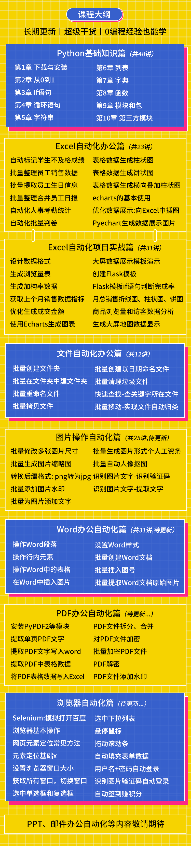 课程涉及Python操作Excel+Word+PDF、Python操作图片+自动化控制浏览器+整理文件等知识;内容详实,手把手带你搞定办公自动化,让你的工作效率翻10倍。