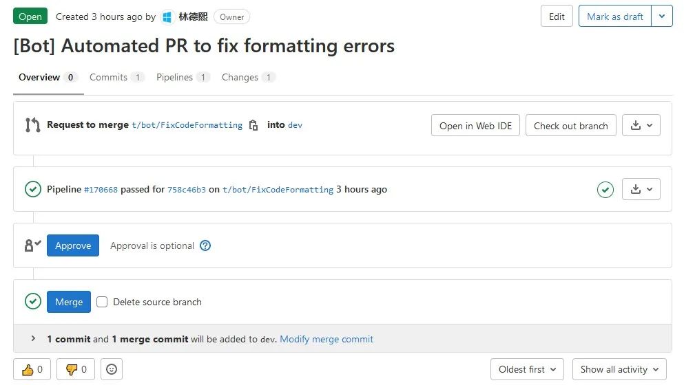 如以下代码就是我所在团队里面的 .gitlab-ci.yml 配置,只需要如下几句话即可自动在 dev 分支有推送的时候,自动格式化代码,然后创建一个创建合并请求