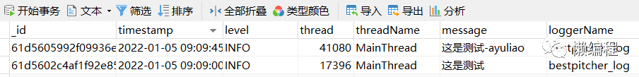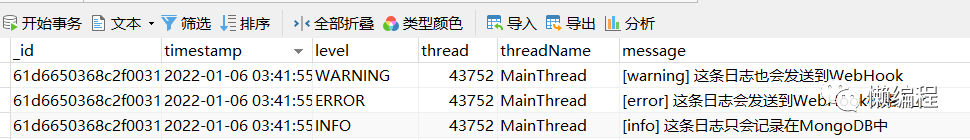实例化 MongoHandler,获得相应的 handler,然后添加到 logger 中,便实现了将日志写入 MongoDB 的效果,如下图: