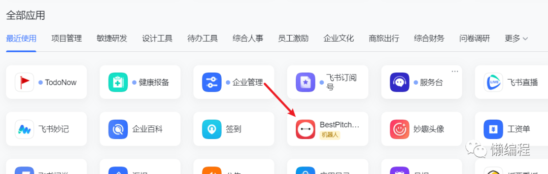 飞书中另外一种机器人是需要通过创建机器人应用的方式创建,这种机器人不在群组里,而是在工作台中,比如下图我创建了自己的应用机器人。