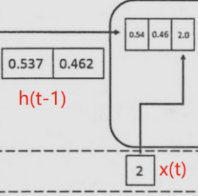 将上一时刻的状态h(t-1),与当前时刻的输入x(t)拼接成一维向量作为全连接的隐藏层的输入,对应隐藏层的的输入维度为3 (如下图的输入部分)。