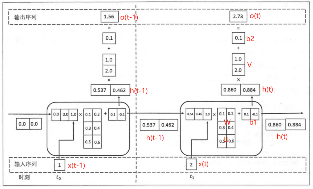 隐藏层输出状态h(t)为[0.86, 0.884],输出层权重矩阵为[[1.0], [2.0]],偏置项b1为[0.1], h(t)经由输出层的矩阵运算为:h(t) * V +偏置项(b2)后,输出o(t)