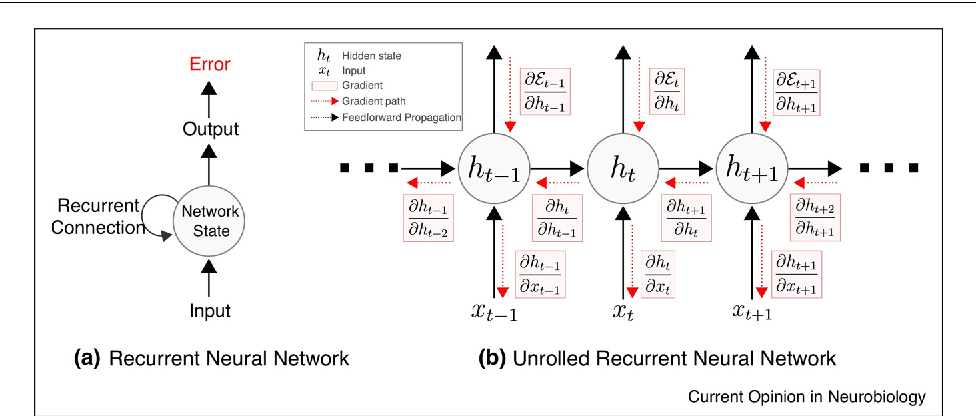 RNN的优化过程与全连接神经网络没有本质区别,通过误差反向传播,多次迭代梯度下降优化参数,得到合适的RNN模型参数 (此处忽略偏置项) 。