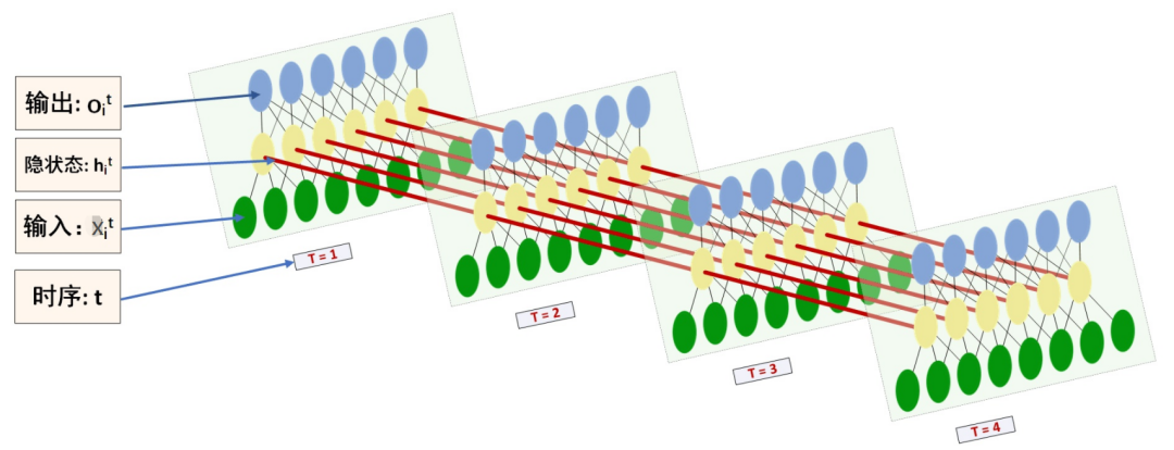 如上图,RNN模型(如左侧模型,实际上也只有这一个物理模型),按各个时间步展开后(如右侧模型),可以看作是按时间步(t)串联并共享( )参数的多个全连接神经网络。展开后的立体图如下: