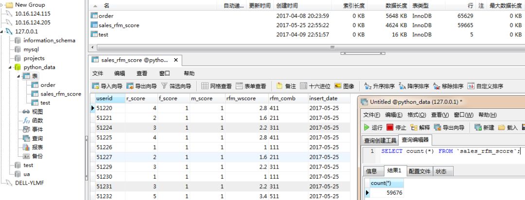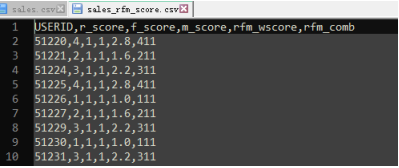 本节案例的输入源数据sales.csv和源代码chapter5_code1.py位于“附件-chapter5”中,默认工作目录为“附件-chapter5”(如果不是,请cd切换到该目录下,否则会报“IOError: File sales.csv does not exist”)。程序输出RFM得分数据写入本地文件sales_rfm_score.csv和MySQL数据库的目标数据表(sales_rfm_score)。