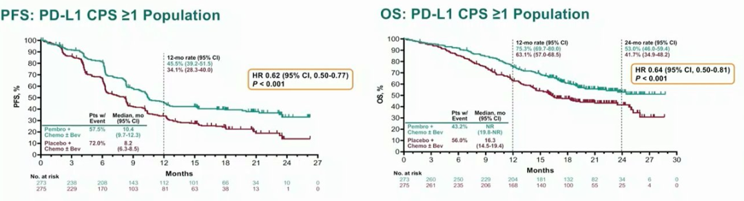 至此,Pembrolizumab与化疗联用将晚期宫颈癌一线治疗OS数据在无论PD-L1表达的所有人群中提高到了mOS 24.4 vs 16.5 mos (HR=0.67, p<0.001),是2014年贝伐+化疗作为一线治疗约16个月的OS数据的1.5倍。