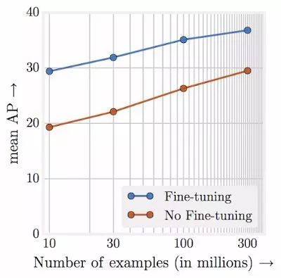 该图来自「重新审视数据的不合理的有效性(https://ai.googleblog.com/2017/07/revisiting-unreasonable-effectiveness.html)」,并展示了在训练集的规模增长到数以亿计的情况下图像分类的模型准确率如何持续增加。Facebook 最近进行了更进一步的探索,使用数十亿有标注 Instagram 图像在 ImageNet 图像分类任务上取得了最优的准确率(https://www.theverge.com/2018/5/2/17311808/facebook-instagram-ai-training-hashtag-images)。这表明,即使对于已有大型、高质量数据集的任务来说,增加训练集的大小仍然可以提高模型效果。