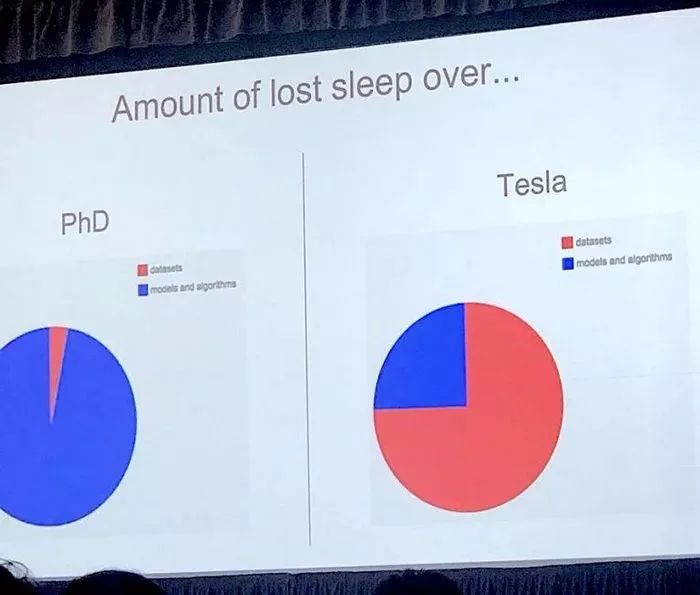 Andrej Karpathy 在 Train AI(https://www.figure-eight.com/train-ai/)进行演讲时展示了这张幻灯片,我非常喜欢它!它完美地展现了深度学习的研究与实际的生产之间的差异。学术论文大多仅仅使用公开数据中的一小部分作为数据集而关注创造和改进模型。然而据我所知,当人们开始在实际的应用中使用机器学习时,对于训练数据的担忧占据了他们的大部分时间。