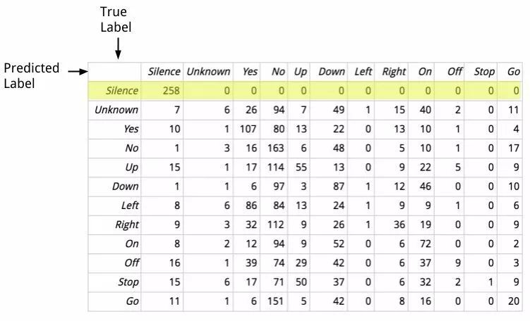 表中的每一行代表一组与真实标签相同的样本,每列显示标签预测结果的数量。例如,高亮显示的行表示所有无声的音频样本,如果你从左至右阅读,则可以发现标签预测的结果是正确的,因为每个标签都落在」Silence」一栏中。这表明,该模型可以很好地识无声的音频片段,不存在任何一个误判的情况。从列的角度来看,第一列显示有多少音频片段被预测为无声,我们可以看到一些实际上是单词的音频片段被误认为是无声的,这其中有很多误判。这些知识对我来说非常有用,因为它让我更加仔细地观察那些被误认为是无声的音频片段,而这些片段事实上并不总是安静的。这帮助我通过删除音量较低的音频片段来提高数据的质量,而如果没有混淆矩阵的线索,我将无从下手。