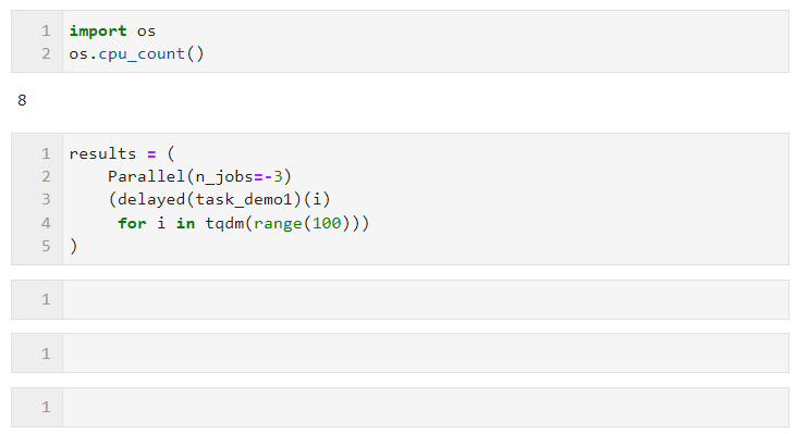 joblib中实现并行计算只需要使用到其Parallel和delayed方法即可,使用起来非常简单方便,下面我们直接以一个小例子来演示:joblib实现并行运算的思想是将一组通过循环产生的串行计算子任务,以多进程或多线程的方式进行调度,而我们针对自定义的运算任务需要做的仅仅是将它们封装为函数的形式即可,譬如: