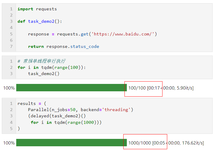 接着只需要像下面的形式一样,为Parallel()设置相关参数后,衔接循环创建子任务的列表推导过程,其中利用delayed()包裹自定义任务函数,再衔接()传递任务函数所需的参数即可,其中n_jobs参数用于设置并行任务同时执行的worker数量,因此在这个例子中可以看到进度条是按照4个一组递增的,可以看到最终时间开销也达到了并行加速效果: