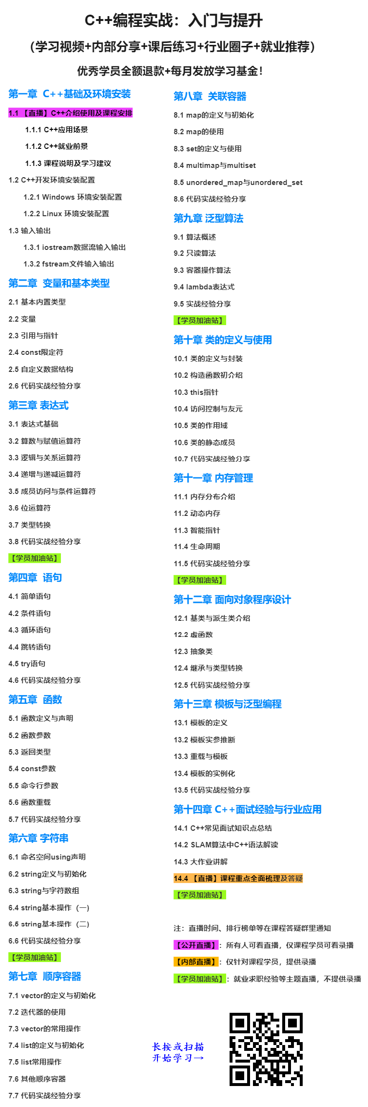 - 课程相关的内部直播提供录播。但注意学员加油站直播仅限学员观看,且不提供录播,涉及内容包括:求职经验、行业趋势、论文讲解、SLAM学习经验等。请留意课程内通知并及时参加。
