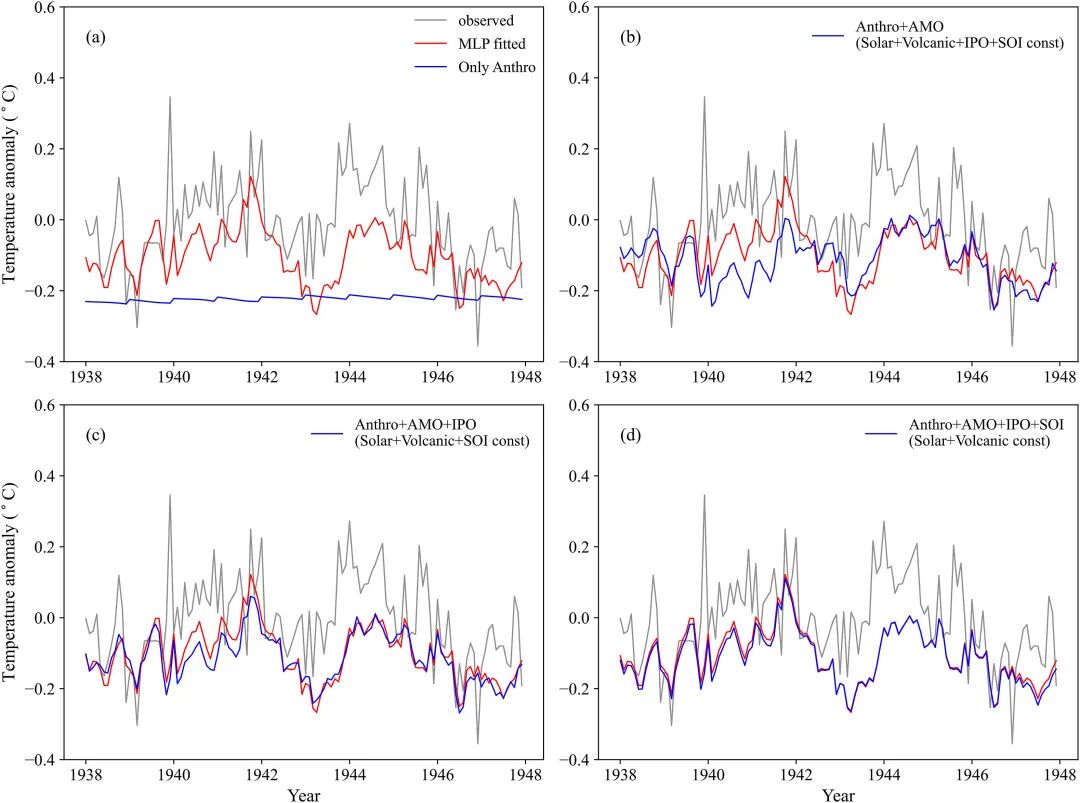 由于难以重建二战时期(1941-1945年)全球气温的“异常偏暖”现象,以往研究多将之归为由海温观测误差引起。本研究中,MLP成功重建了这段时期的“异常偏暖”情况(图2)。AMO和 IPO是造成该时期GST/OST年际变化和年内变化的主要影响因素。这也表明这一异常暖期不是完全由探测误差引起的,而是真实存在的。这些发现表明MLP同时具有表达长期和短期气候变化的能力,将有助于加深对年际和年代际温度变化机制的理解,有利于监测气候变化对特定因素的快速反馈,并作为更好地预测气候变化的理论基础。