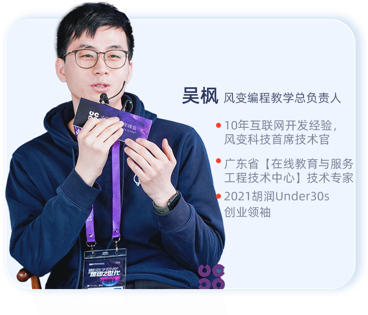 他们研发过多门爆款课程,具备丰富的经验,知道如何打造更实用的课堂。这门Python,就是风变编程教学总负责人兼CTO吴枫的匠心大作。