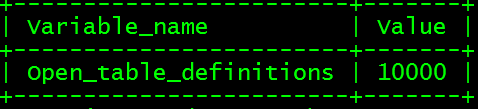 通过对比可以看出,重启后两种场景的TDC生效值分别已达到预期的10000和50000。同时,我们在此处对比另外一个变量open_table_definitions,这个变量表示在当前状态下打开的表结构数量,两种场景下在MySQL实例刚刚重启后由于TDC的不同,打开的表结构数量是不同的: