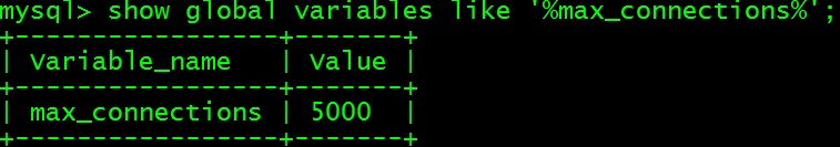 设置配置文件中max_connections值为5000,其他配置沿用前文。以非root用户启动MySQL实例,在数据库中查看max_connections的值: