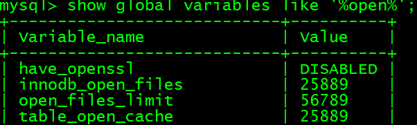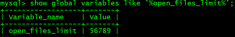 此模式下,requested_open_files=56789,max_connections生效值5000,算式(requested_open_files - 10 - max_connections) / 2值为25889>400,故limit=25889,同时小于配置文件中的设置值,故最终生效值应为25889。在数据库中查看变量的实际生效值: