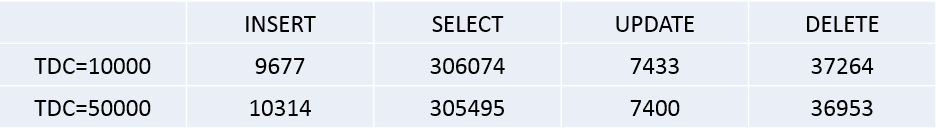 随后我们来比较TDC的差别是否会对性能产生影响。测试使用sysbench工具模拟客户端向服务器发送请求,申请访问的表数量为35000,连接并发数为50,连接发送请求持续时间为5min,使用以上测试模式分别测试TDC=10000和TDC=50000两条件下四种基本SQL语句的qps,对比结果如下:
