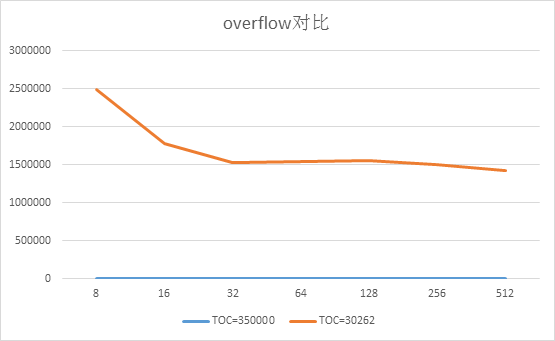 从曲线图可以看出,TOC较大的模式下overflow值非常小(基本为0),这与该模式下缓存命中率较高的结果相吻合;但TOC较小的模式下则存在较大的overflow,这说明该模式下较小的缓存无法满足大量的并发访问请求,缓存不得不持续将新表刷入内存。