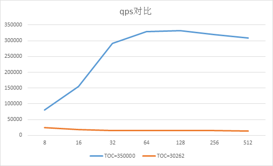从曲线图可以看出,TOC较大(=350000)的条件下,查询语句的qps随并发数增加变化比较明显,整体呈现先迅速上升后平稳回落的趋势,在64-128并发范围内达到高峰。反观TOC较小(=30262)的模式下qps随并发数的增加无明显变化,而且持续处于较低水平。
