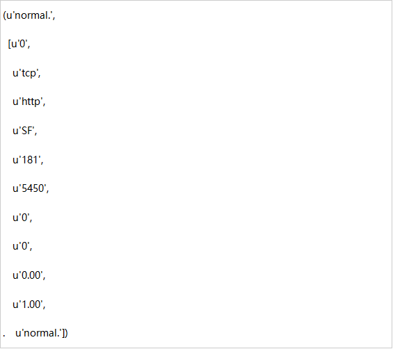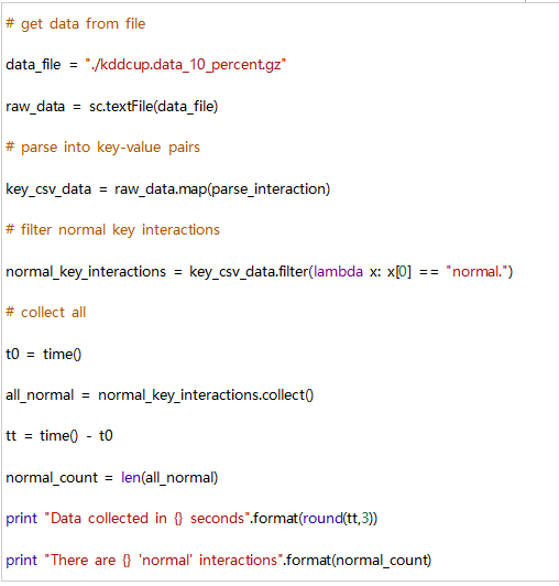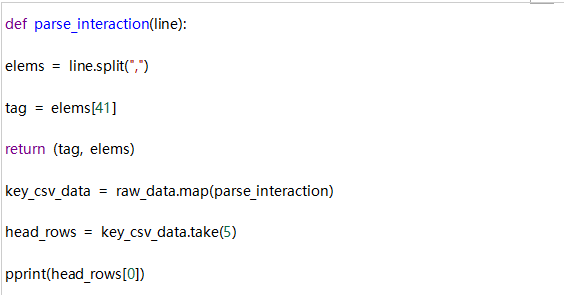 现在,我们希望将RDD中的每个元素都用作键值对,其中键是标记(例如正常值),值是表示CSV格式文件中行的整个元素列表。 我们可以按如下进行,这里我们使用line.split()和map()。