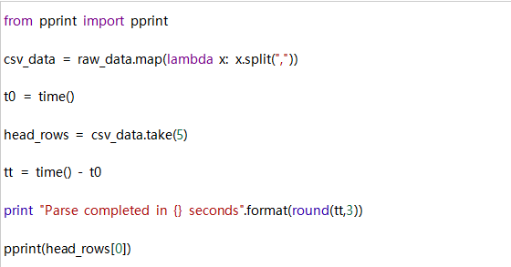 在这种情况下,我们想要将数据文件作为CSV格式文件读取。我们可以通过对RDD中的每个元素应用lambda函数。如下所示,这里我们将使用map()和take()转换。