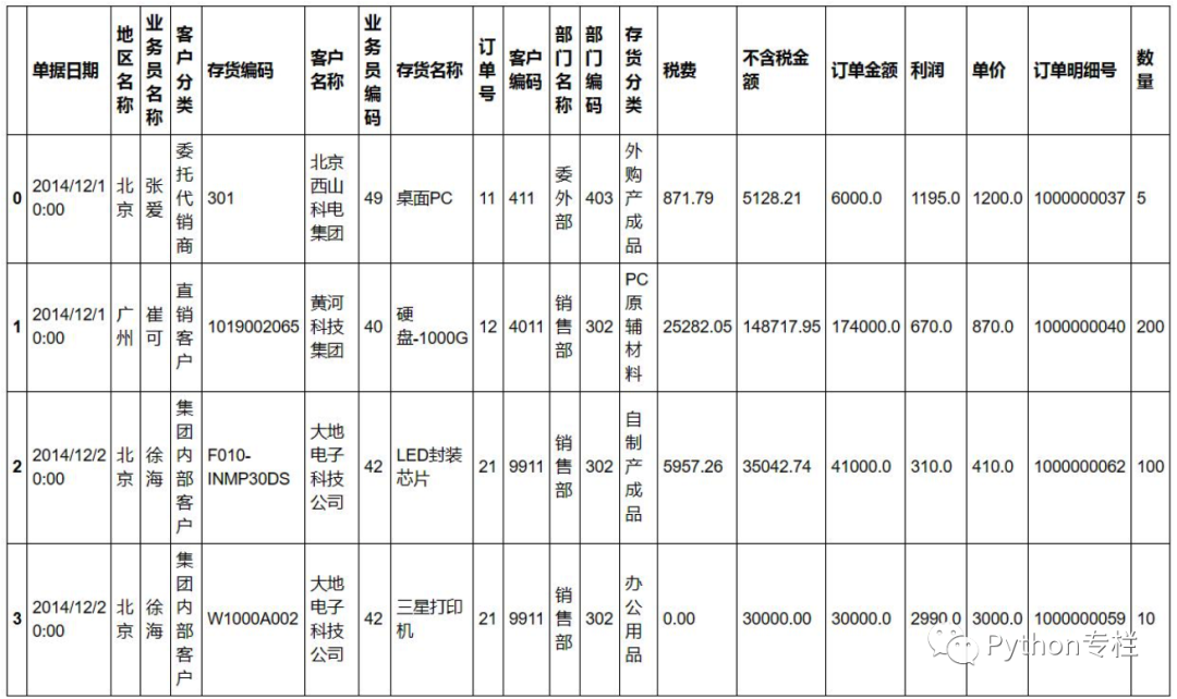df1=sale[['订单明细号','单据日期','地区名称', '业务员名称','客户分类', '存货编码', '客户名称', '业务员编码', '存货名称', '订单号',
