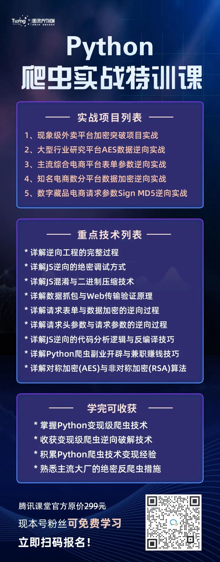腾讯课堂官方特训费299元,本号粉丝有福利,立即报名可免费学习!这是一套专讲爬虫与反爬虫攻防的实战课程,迄今为止已经帮助了超3W学员快速进阶!本次课程将由国际大数据竞赛获奖大佬亲身指导,带领大家进行一线前沿技术理论+多重逆向破解项目实战的综合技术速成训练!
