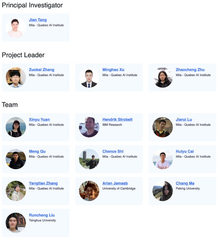 这一平台的项目负责人为加拿大蒙特利尔学习算法研究所(Mila)副教授、终身教授唐建,其研究领域包括几何深度学习、图表示学习、图神经网络、药物发现及知识图谱。唐建 2014 年毕业于北京大学信息科学技术学院并获得博士学位,2014-2016 年任职微软亚洲研究院副研究员,2016-2017 年为密歇根大学和卡内基梅隆大学的联合培养博士后,曾获 2014 年机器学习顶级会议 ICML 的最佳论文。唐建是图表示学习领域的代表性学者,他所提出的网络表示学习算法 LINE 被广泛应用,其他代表工作还包括 RotatE 等。