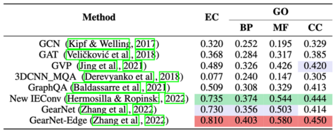 TorchProtein 团队在 EC 和 GO 两个蛋白质功能预测基准上评测了各种蛋白质结构编码模型的性能,结果如下。实现和评测细节见 GearNet 论文(https://arxiv.org/abs/2203.06125)。