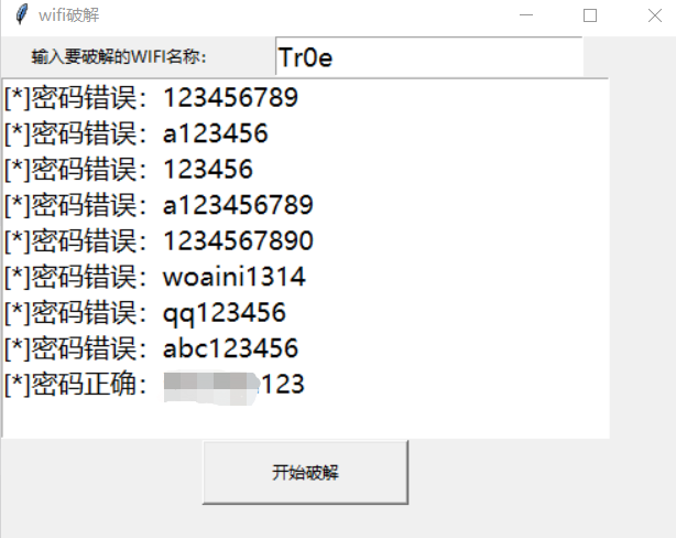 print("正在破解 SSID 为 %s 的 WIFI密码,当前校验的密码为:%s"%("Tr0e",pwd))