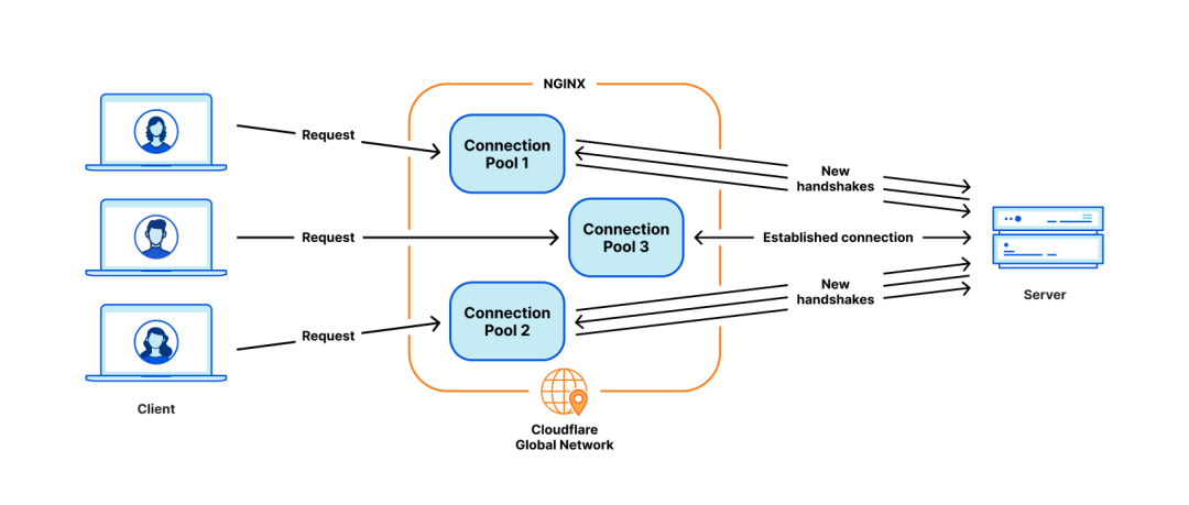 对我们的用例来说,NGINX 中最大的麻烦还在于糟糕的连接重用机制。我们的设备与原始服务器间通过 TCP 连接来代理 HTTP 请求。连接重用会重复使用连接池中包含的原有连接,由此跳过建立新连接所需要的 TCP 和 TLS 握手,从而缩短 TTFB(第一字节时间)。