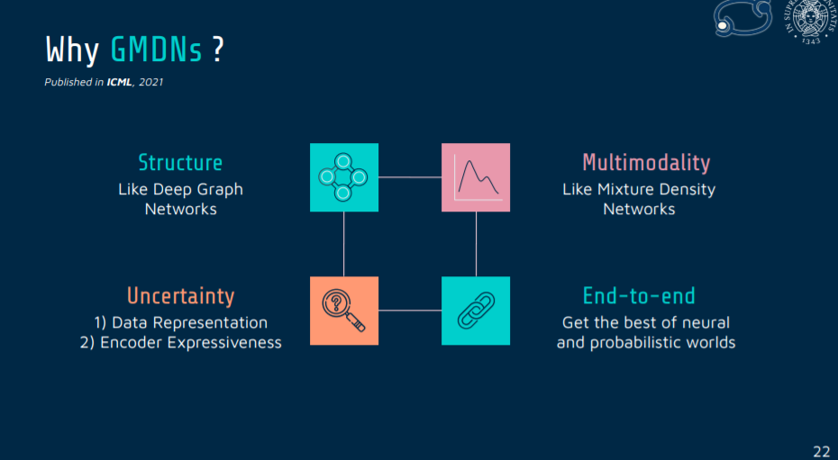 在第五章中,我们利用神经网络和概率网络的优点,设计了一个混合模型,称为图混合密度网络,以输出任意输入图的多模态分布。对合成随机图和真实世界的化学任务的经验评估是为了表明,对于某些问题,图深度学习的“标准”方法不能产生正确的输出。