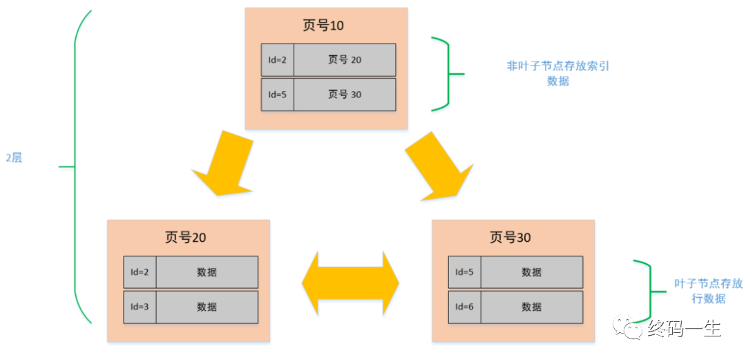 比如说我们需要查找一个 id=6 的行数据,因为在非叶子节点中存放的是页号和该页最小的 id,所以我们从顶层开始对比,首先看页号 10 中的目录,有 [id=1, 页号 = 20],[id=5, 页号 = 30], 说明左侧节点最小 id 为 1,右侧节点最小 id 是 5;6>5, 那按照二分法查找的规则,肯定就往右侧节点继续查找,找到页号 30 的节点后,发现这个节点还有子节点(非叶子节点),那就继续比对,同理,6>5&&6<7, 所以找到了页号 60,找到页号 60 之后,发现此节点为叶子节点(数据节点),于是将此页数据加载至内存进行一一对比,结果找到了 id=6 的数据行。