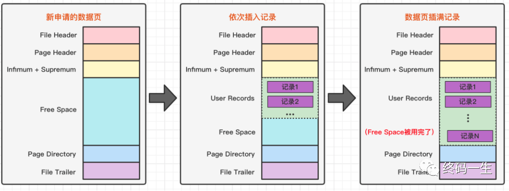 但是在一开始生成页的时候,其实并没有 User Records 这个部分,每当我们插入一条记录,都会从 Free Space 部分,也就是尚未使用的存储空间中申请一个记录大小的空间划分到 User Records 部分,当 Free Space 部分的空间全部被 User Records 部分替代掉之后,也就意味着这个页使用完了,如果还有新的记录插入的话,就需要去申请新的页了。这个过程的图示如下。