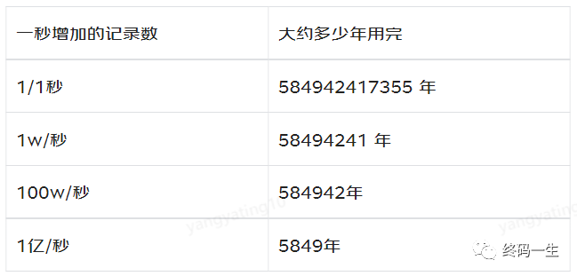 有人统计过,如果建表的时候,自增字段选择无符号的 bigint , 那么自增长最大值是 18446744073709551615,按照一秒新增一条记录的速度,大约什么时候能用完?