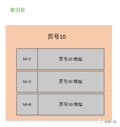 看上图中,我们是单拿一个节点来看,首先它是一个非叶子节点(索引页),在它的内容区中有 id 和 页号地址两部分,这个 id 是对应页中记录的最小记录 id 值,页号地址是指向对应页的指针;而数据页与此几乎大同小异,区别在于数据页记录的是真实的行数据而不是页地址,而且 id 的也是顺序的。