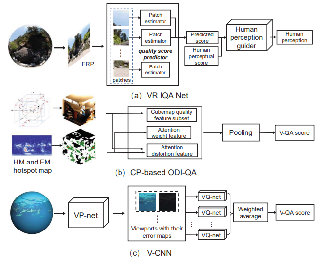 对于 ODI-QA,根据参考图像的可用性,可以进一步将其分为两类:full-reference (FR) ODI-QA 和no-reference (NR) ODI-QA。对于 ODV-QA,Li等人提出了一种基于具有代表性的基于视口的 CNN 方法,包括视口提案网络和视口质量网络,如图所示。视口方案网络生成多个潜在视口及其错误映射,视口质量网络对每个建议视口的 V-QA 分数进行评级。最终的V-QA分数是通过所有视口V-QA分数的加权平均值计算的。Gao等人对ODV的时空扭曲进行了建模,并通过整合现有的3个ODI-QA目标指标,提出了一种新的FR目标指标。