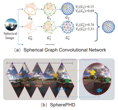 杨等人提出了一个代表性框架,将球面图像映射到基于球面几何形状的旋转等变表示中。(a),SGCN将输入球面图像表示为基于GICOPix的图形。此外,它通过GCN层探索了图的等距变换等方差。在cohen等人的文章中,提出了规范等变CNN来学习二十面体的球面表示。相比之下,shakerinava等人将二十面体扩展到柏拉图固体的所有像素化,并在像素化的球体上推广了规范等变CNN。由于在效率和旋转等价差之间进行权衡,DeepSphere将采样球体建模为连接像素的图形,并设计了一种新颖的图形卷积网络 (GCN),通过调整图上像素的相邻像素数来平衡计算效率和采样灵活性。与上述方法相比,在SpherePHD中提出了另一种具有代表性的ODI表示。如图所示,球面PHD将球面图像表示为球面多面体,并提供特定的卷积和池化方法。