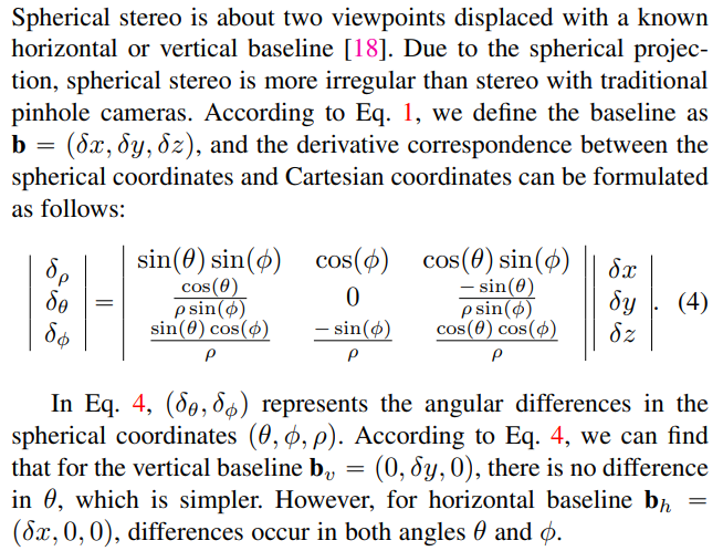 人类双眼视差取决于视网膜上投影之间的差异,即球体投影而不是平面投影。因此,ODI上的立体匹配更类似于人类视觉系统。在Seuffert等人的工作中,他们讨论了全向失真对基于CNN的方法的影响,并比较了从透视和全向立体图像预测的视差图的质量。实验结果表明,基于ODI的立体匹配对于机器人、AR/VR等多种应用更具优势。一般立体匹配算法遵循四个步骤:(i)匹配成本计算,(ii)成本聚合,(iii)优化差异计算,以及(iv)差异细化。作为首个基于DNN的全向立体框架,SweepNet提出了一种宽基线立体系统,用于从采用超广角FoV镜头的相机拍摄的一对图像中计算匹配的成本图,并在钻机坐标系上使用全局球体扫描直接生成全向深度图。