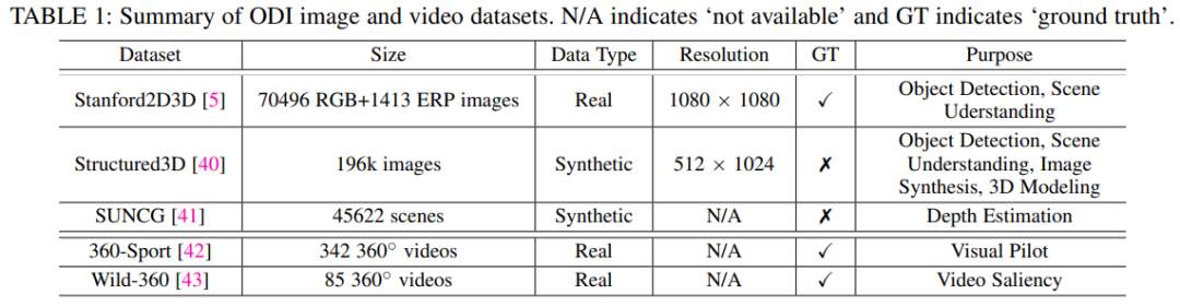 基于深度学习的方法的性能与数据集的质量和数量密切相关。随着球面成像设备的发展,大量的ODI和OPV数据集被公开用于各种视觉任务。特别是,大多数ODV数据都是从维梅奥和优酷等公共视频共享平台收集的。在表格Table1中,我们列出了一些用于不同目的的代表性 ODI 和 ODV 数据集,我们还显示了它们的属性,例如大小、分辨率、数据源。更多的数据集可以在全文以及补充材料中找到。